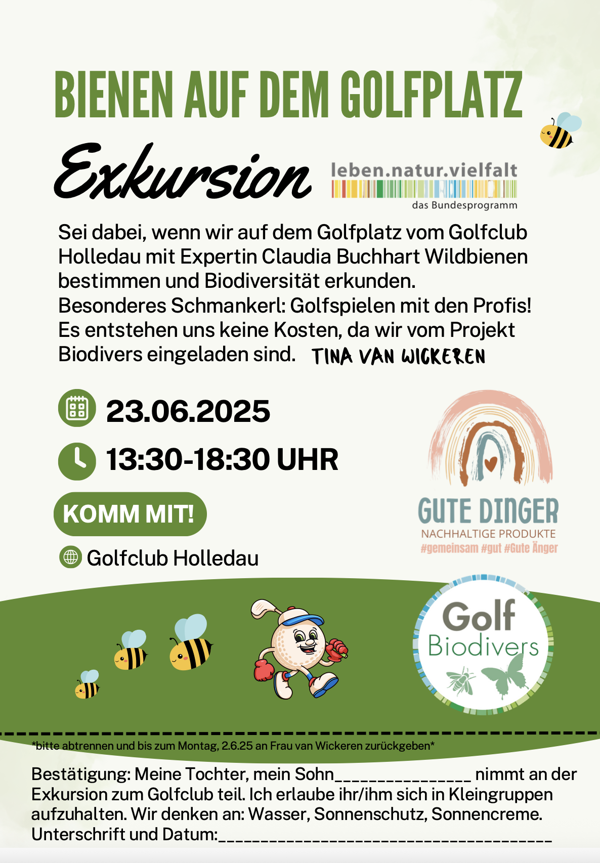Wir möchten uns herzlich bei Dietmar Strunz (Leiter des Golfclubs) und auch bei Tina van Wickeren, Lehrerin an der Guten Änger Realschule, bedanken, ohne die diese Exkursion nicht stattgefunden hätte. Ein besonderer Dank gilt Claudia Buchhart und dem Projekt Biodivers. Das Projekt, das die Exkursion vor Ort sowie die Fahrten mit dem Bus finanziert hat. Auch dem DGV danken wir für die Unterstützung, die es uns ermöglicht hat, den Trainern eine kleine finanzielle Anerkennung zukommen zu lassen.